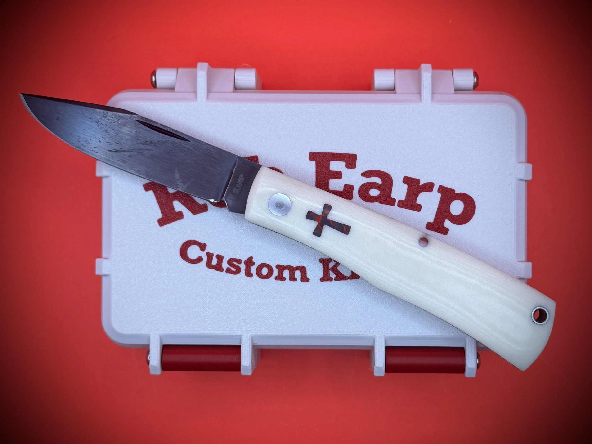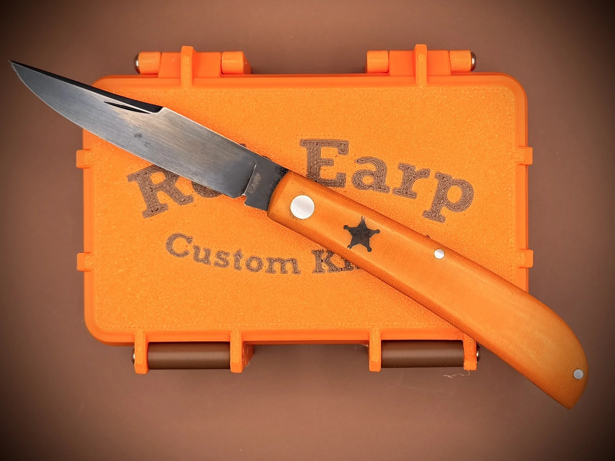 Leaving for Blade Texas in two days, but I had three knives to finish up before I leave. I have finished two and hope to get the other ready tomorrow. Take a look below at what I have been working on. A Tombstone in orange with the Wyatt Earp Marshall Badge inlay and a new model, the Comadre, in white linen.